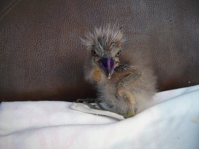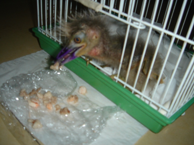 猜想应该是一种肉食性鸟类,于是切了少量的新鲜猪肉丁,放置在其面前。结果雏鸟把它大大的嘴巴迫不及待地伸到肉堆中,大口大口的开始吃起来,那饥饿的样子,令人想起凶猛的禽鸟。把手指伸到其前方,雏鸟也会灵活地跟踪啄食,感觉其天性亦是比较好斗的。
