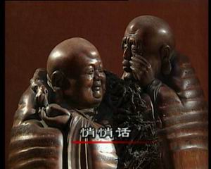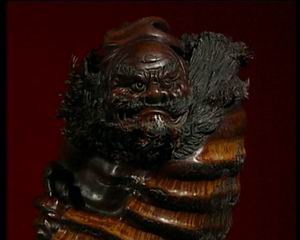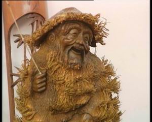 张德和:“传统的竹根雕它讲究的是雕功,功多艺少,现在的竹根雕是艺多功少,比如说传统的竹根雕把所有的衣纹都雕刻出来,如果不翻过来看的话,看起来好像一件木雕,现在的竹根雕讲究的是天人合一,首先把一块材料拿过来看它的自然形状,比如说它象钟魁,之后就把它构思把毛竹的根须利用起来,变成钟魁的胡须,就是在关键的地方做适当的雕刻,其它的地方顺其自然。”