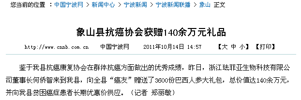 一个象山的不知所谓的“抗癌协会”如果因为拿了厂家一些好处,而变着戏法干出助纣为虐的事情,真的是太不足为奇了,现今这一切向钱看之中国,做人做事还有底线吗?大家看看最近的新闻吧,无需我多言。多年前我还在象山时,象山台甚至有的个别省台就天天打各种“灵丹妙药”的广告,现在象山报也放这种变相广告,我完全可以理解,因为而今之中国,有奶便是娘,管你死与活。记者都是拿钱才写稿,不塞钱就给企业放负面报道,无耻啊无耻