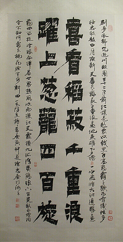 此次来家乡办个展,徐志康共展出书法作品100幅,其中一半以上为新创作品。其中,颂赞宁波人援建汶川地震灾区的漆书《铭记历史》,以及描写宁波繁华美景的《望海潮》,都寄托了徐志康对家乡的浓浓深情。。。。。。