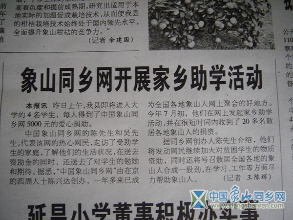 第二天,《今日象山》报就刊出了我们同乡网助学的消息,效率够高的!