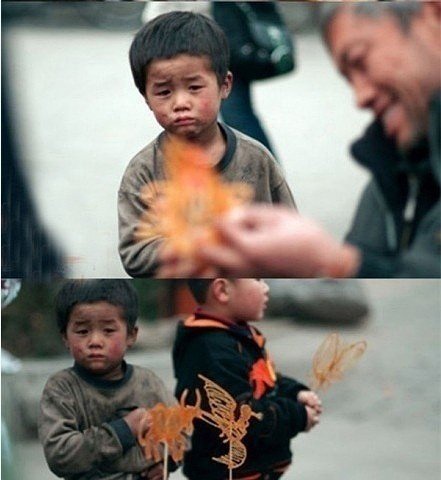 年度最值得同情的照片。孩子成长在中国是一种考验,躲过了奶粉,躲过了杀害,躲过了校车,躲过了豆腐渣教学楼,可是他躲不过悲惨的命运,年纪小小,单衣薄裤看着手艺人手中的糖人,他只能带着一种自卑,看着那些不会属于他的东西。