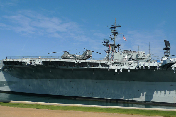 中途岛号航空母舰1945年3月下水服役,曾参加过二战,下水六个月后,日本就宣布投降了。此后,便成为了美军后来对朝、对越战争中的杀伤性武器,并由此作为太平洋舰队旗舰派驻日本,成为美军第一艘驻外航母。1992年,中途岛号作为美军中服役年限最长的战舰而退役。在服役的47年期间,大约一共有225,000美军曾在中途岛号航空母舰上服役。2004年,它被作为海上军事博物馆对外开放,由此成为了圣地亚哥一个著名游览景点。 登舰后可依次参观机库、飞行甲板和舰岛。航空母舰上的先进设备都已拆除,现在只能见到一些当年的模型,体味官兵们的生活。机库内展出若干飞机导弹实物,另外有发动机维修展示等等。飞行甲板可见到各种舰载机,如F-14, A-6, E-2等等。航空母舰甲板有一个足球场大,里面的设备更多,可以看到航母甲板上面很多各种真的战机,而并非模型。