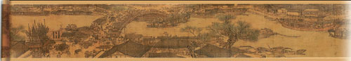 《清明上河图》为故宫书画代表作品该画为张择端所作,以精致的工笔记录了北宋末叶、徽宗时代首都汴京(今开封)郊区和城内汴河两岸的建筑和民生。全图分为三个段落。在五米多长的画卷里,共绘了550多个各色人物。
