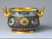 掐丝珐琅缠枝莲纹象耳炉为故宫珐琅的代表作品。元代出品,通高13.9cm,口径16cm,足径13.5cm.清宫旧藏。此器釉质莹润,有的部分釉质呈玻璃般的透明状,珐琅色泽浑厚谐调,富丽典雅。