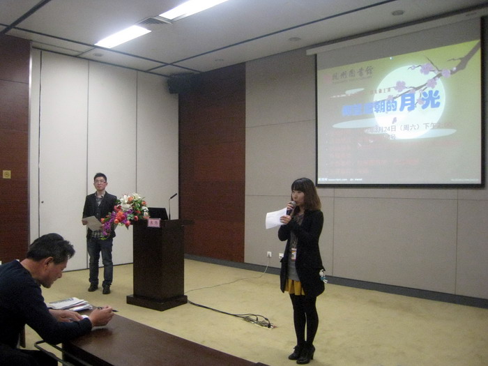 主讲人德清县图书馆朱炜具体介绍了《静夜思》的不同版本,及直译、韵译、歪译...,以及该诗的国际交流情况;播放古今中外吟咏方式的录音,并开展互动——请一位听众用家乡方言吟咏。