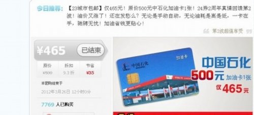 记者昨日了解到,从本月23日起,24券网站便推出一项商品,即“仅花465元就可以购买原价500元中石化加油卡一张”,该团购活动从本月23日开始上线,已经持续了2波,第一波于23日上午上线中午即结束活动,共有5182人购买,而第二波于23日下午上线,直到昨日中午结束活动,共有7762人购买,加起来共吸引上万人参与。