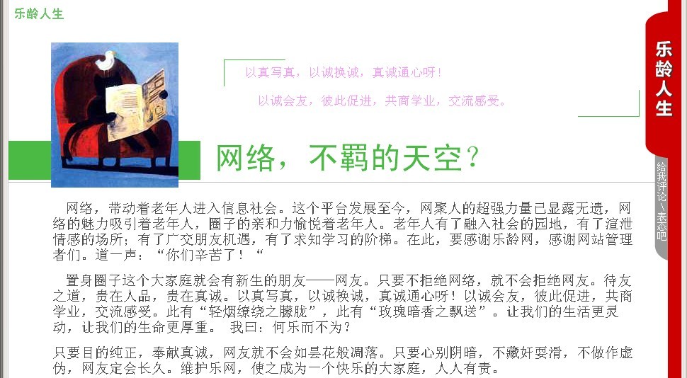 《乐龄网》目前开设旅游、摄影、家常、杂谈、文学、园艺、综艺七个圈子,管理人员大多是年轻人,他(她)们兢兢业业、尽心尽力为中老年人服务;每个圈子邀请2至3名圈主协助网管将网站办成“退休与准退休人群的网上家园”。这种敬业精神与求实作风,给我留有深刻印象。