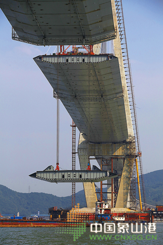 烈日下持续作业的施工人员个个汗流浃背,他们各司其职、一丝不苟地完成钢箱梁的船舶定位、吊具连接、起吊、定位等工序。至昨日傍晚,随着第97段钢箱梁吊装就位,象山港大桥主桥合龙施工进入“20米”倒计时。