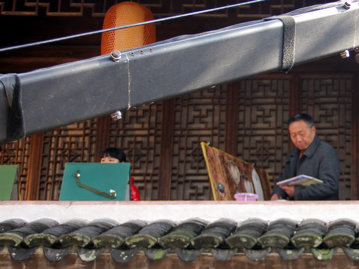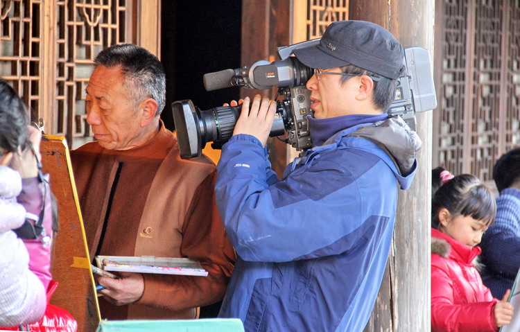 民间画家吴蒙蒙先生在古城创作渔文化作品的情景,被选入镜头。