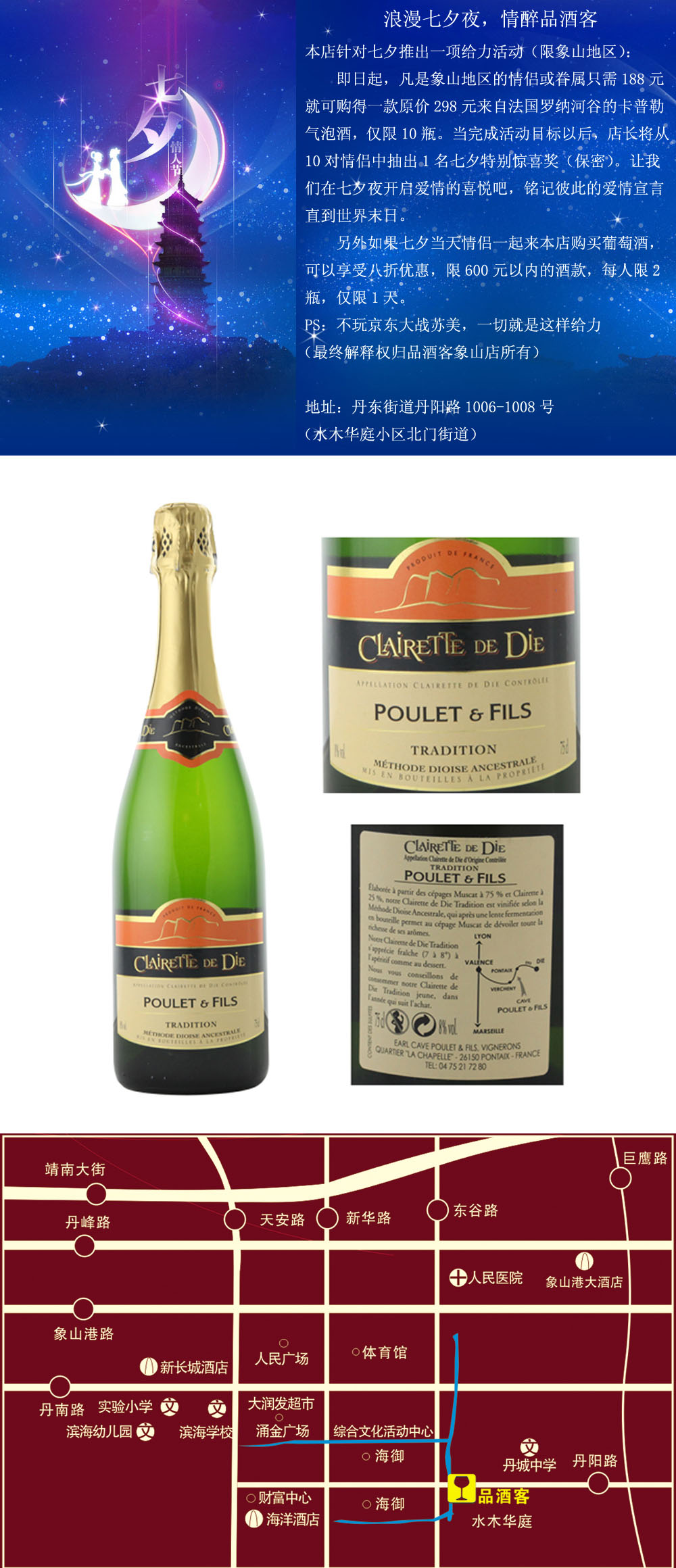 另外如果七夕当天情侣一起来本店购买葡萄酒,可以享受八折优惠,限600元以内的酒款,每人限2瓶,仅限1天。