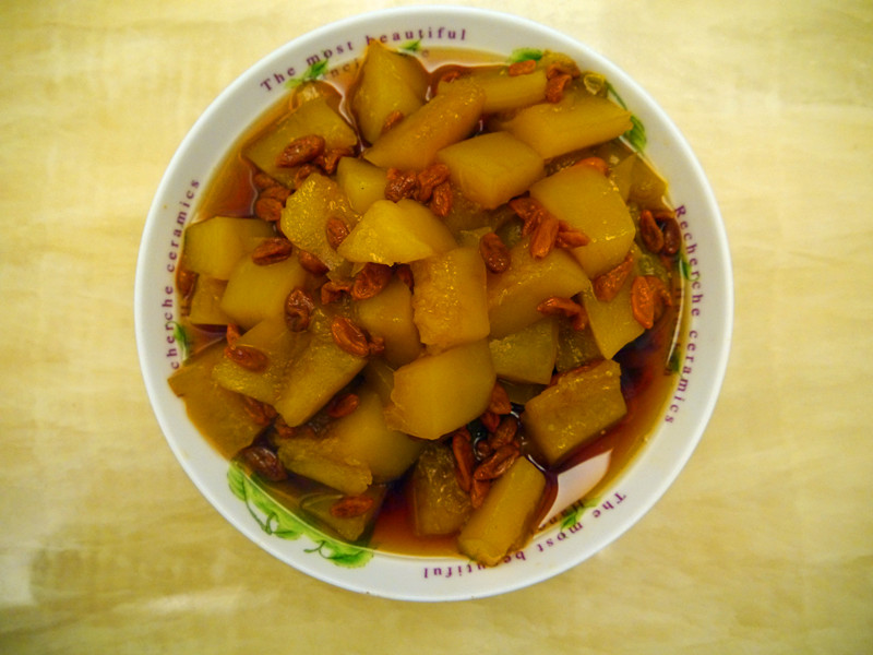 南瓜在水里煮开后,放入冰糖和枸杞小火再煮10分钟即可。南瓜入口就化了,这是我最爱吃的一道甜品。