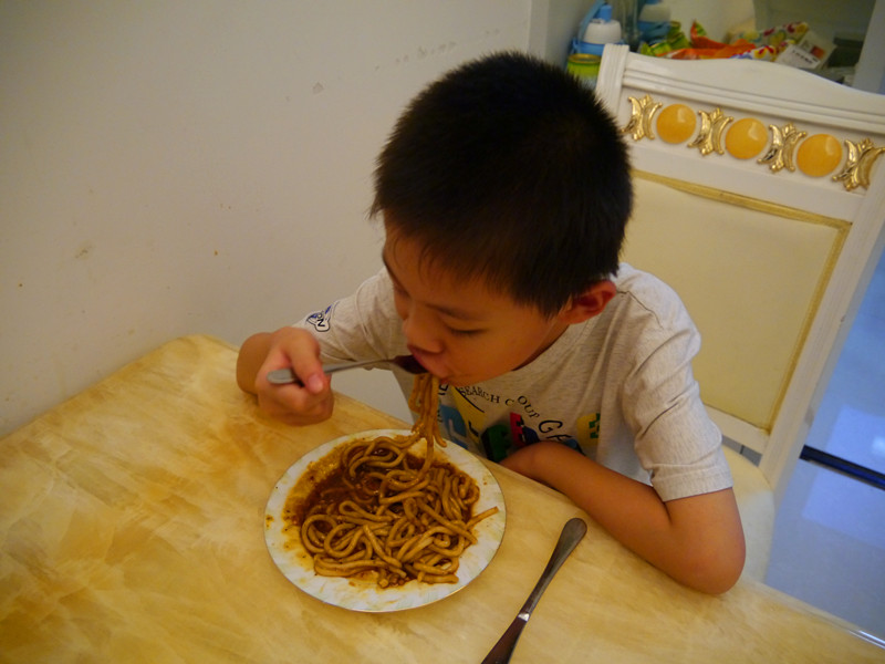 这是转转经常吃的面食,味道可好啦!酱是用色拉油、洋葱、肉末、糖、美味鲜酱油、番茄酱、胡椒粉、蚝油做的。沸水中加入少量橄榄油和盐,乌冬面在沸水中焯过。然后,面和酱拌匀。