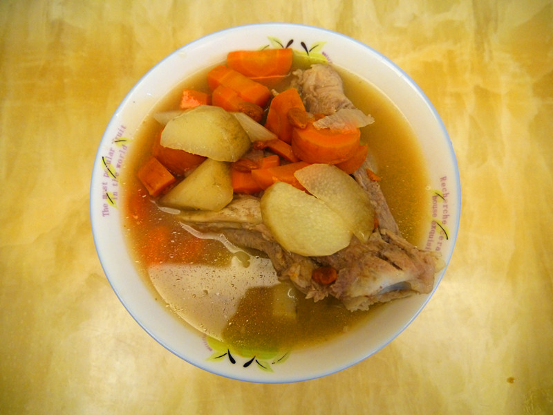 用一个浓汤宝煮猪骨头、枸杞、山药、胡萝卜,此汤主要用来补充营养,味道也很不错,孩子很爱吃。