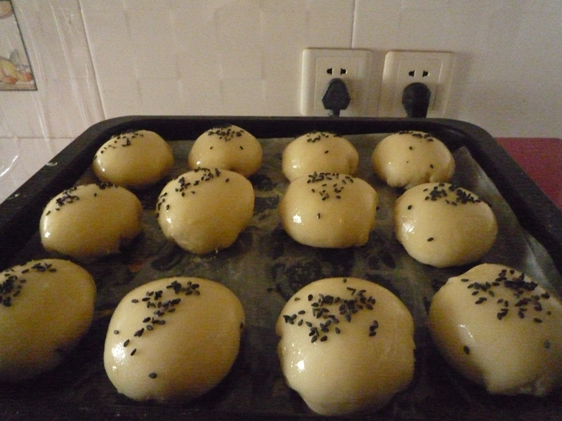 5、作成的月饼上面刷上蛋液,点缀上黑芝麻;