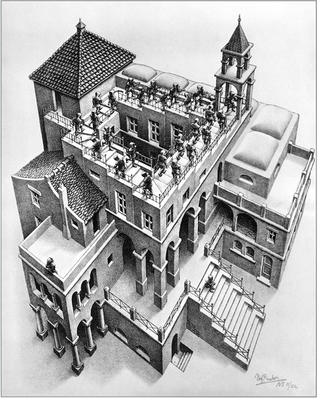 埃舍尔的作品以数学性而闻名,从中可看到对分形、对称、密铺平面、双曲几何和多面体等数学概念的形象表达,在鉴赏那些不可思议的空间结构时,人们甚至会产生这样的念头:剖开画家的脑袋、看看是怎样诞生出如此怪异的!