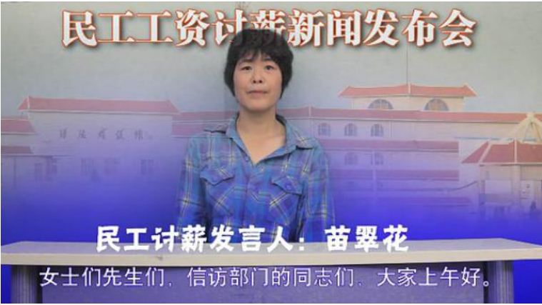 近日,一则“民工版新闻发言答记者问,看了我太痛心了”的视频在微博上蹿红,一名身着蓝色方格衬衣的中年妇女模仿外交部新闻发言人讨要工资,在她身后的背景板上写着“民工工资讨薪新闻发布会”的字样。在4分03秒的“讨薪发布会”上,这名“民工讨薪发言人”苗翠花以“动之以情、晓之以理”的方式,将自己的讨薪缘由、讨薪过程娓娓道来。在“讨薪发布会”的最后,现场还有“记者”对“讨薪发言人”进行了提问。