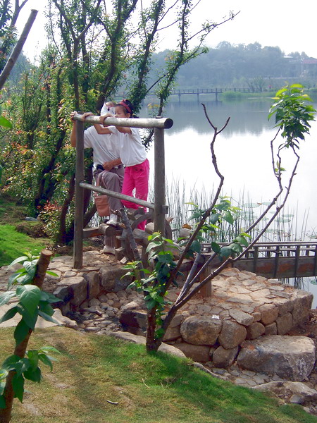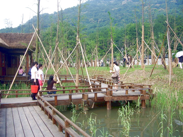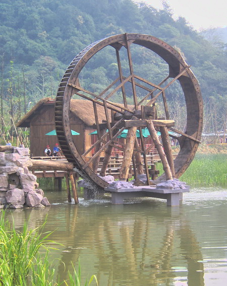 高大的木水车缓缓转动,曲折的小木桥人来人往。在两架脚踏水车处、不时有游客上去,试试是否能车上水来。
