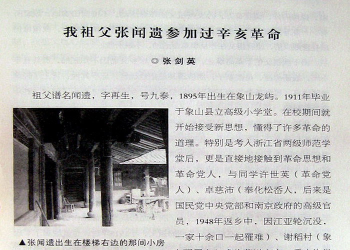 打开《辛亥革命之象山记忆》一书的目录,见有张剑英先生《我祖父张闻遗参加过辛亥革命》一文,感到十分欣慰。