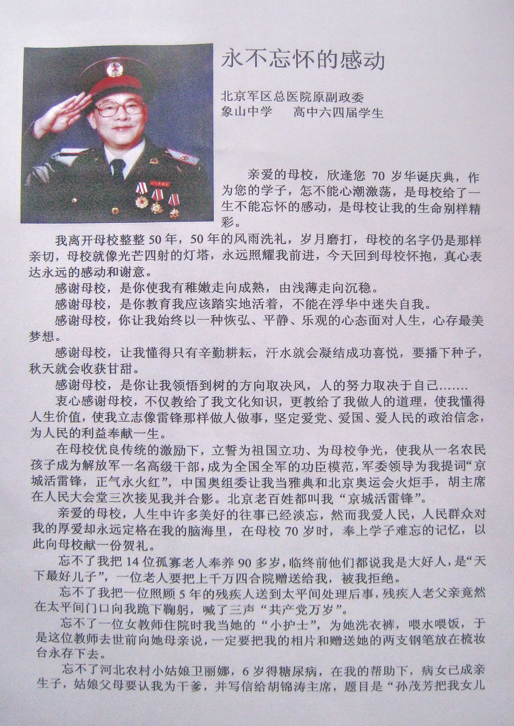 我握着他的手、注视良久:回想起半个世纪前艰辛的求学之路,回想起去年1月《杭州雷锋纪念馆》吴在明主任对学长的介绍,回想起二弟单骑赴京迎奥运学长的帮助……