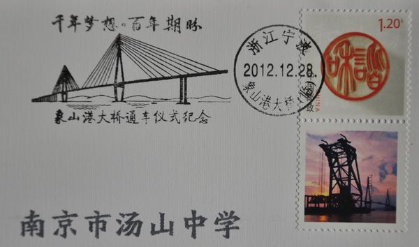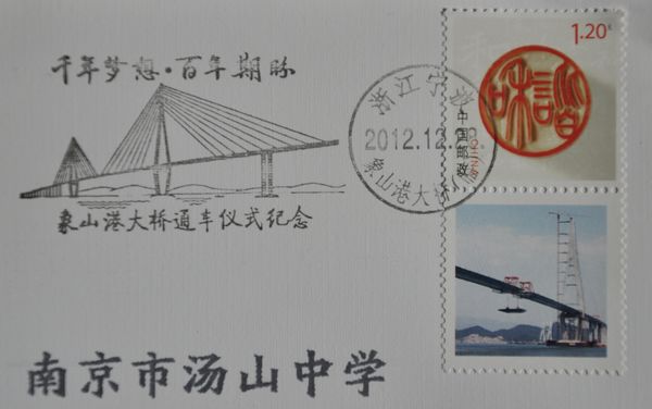 如图是象山港大桥通车仪式纪念封,所贴邮票是用《和谐》个性化邮票制作的“象山港大桥”个性化邮票。