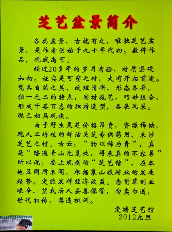 今年一月上旬,去定塘镇开会,在饭余之际,到离休老人葛志明家参观了”定塘灵芝艺术馆”,现经其本人同意,将通过20---30年的辛勤采伐和艺术加工后的野生灵芝做成盆景,现用图片形式记录下250余盆,在此上传与大家共享!