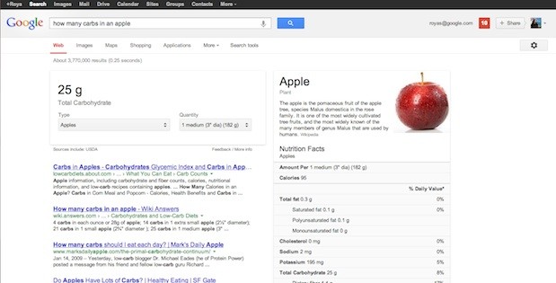 Google 刚刚成为注重饮食健康人士的好朋友,因为他们刚刚将超过一千项有关食物营养的问答加入搜寻功能中。用户可以在搜寻列输入问题去查询食物的某项营养有多少,例如「How many carbs in an apple」(一个苹果里有多少碳水化合物),Google 就会以 Knowledge Graph 的形式去显示出相关资讯,它甚至看得懂「carbs」就是「carbohydrate」简写的意思。用户亦可以在左边的选单里选择那项食物的数量,方便计算某项营养的份量有多少。这个功能支援桌面电脑和手机网页版的 Google,但可惜目前只是支援美国地区和英语问题而已,如果你身在美国的话,在未来十天内就可以用到它啦。