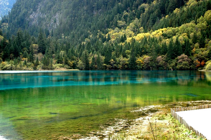 第二天,我们用了一整天的时间游览九寨沟。九寨沟主沟呈“Y”字形,总长50余公里。沟内河谷湖泊众多,山上丛林密布,加上激流飞瀑,相映成趣。车一进沟,我们的眼球便被那晶莹清亮的水吸引住了。你看它,时而静如处子,静静地躺在绿树从中,映照着蓝天白云和丛林花树;时而动若脱兔,在花树之间蹦蹦跳跳,穿梭奔流。在这里,我们用自己的双眼见证了“鸟在水里飞,鱼在天上游”的奇绝风景,终于信服了“九寨归来不看水”的传言。