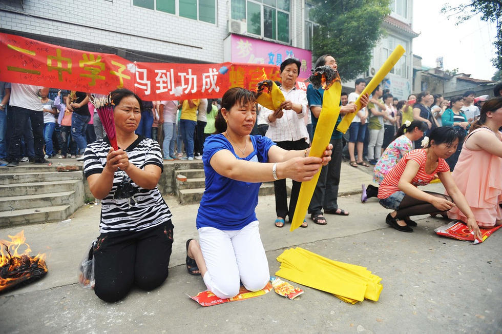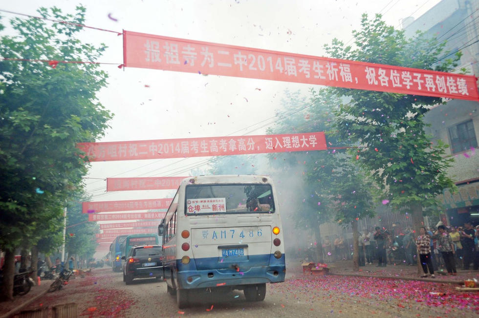 新华网,据凤凰网报道,6月6日,武汉新洲二中门口,鞭炮、礼花、礼炮也于8时8分同时被点燃。上万名居民自发聚集到校门口的路边,为即将去邾城街参加高考的千余名考生送行。警车开道,66辆送考车依次驶出校门。此时,送考家长和村民烧纸跪拜,点燃鞭炮,锣鼓喧天。