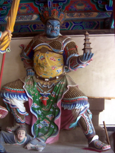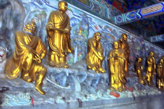 经甬道过碑林便是天王殿,外有两大金刚、内是四大天王像;天王殿后的大雄宝殿供奉着释迦牟尼、阿弥陀佛、药师神像,屏墙后悬塑观音像,两侧为十八罗汉侍立。大雄宝殿后的藏经阁、是寺僧藏经说法的场所。殿前甬道有明万历年间铸造的大铁钟一只,重约650千克。该阁东南面禅房是僧人参禅打坐的地方,对面西禅房是负责接待宾客的堂室。
