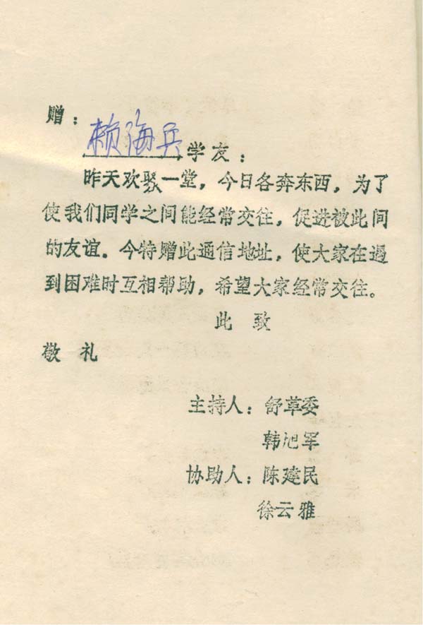 虽然我只在这个班集体生活了一年半时间,但大家还记得我,使得通讯录上我有一席之地。还有像册子上主持人之一的舒革委同学现已改名,1987年我第一次回象山时见过一面。这本通讯录是打字机打印的,分发时间可能在1990年前。